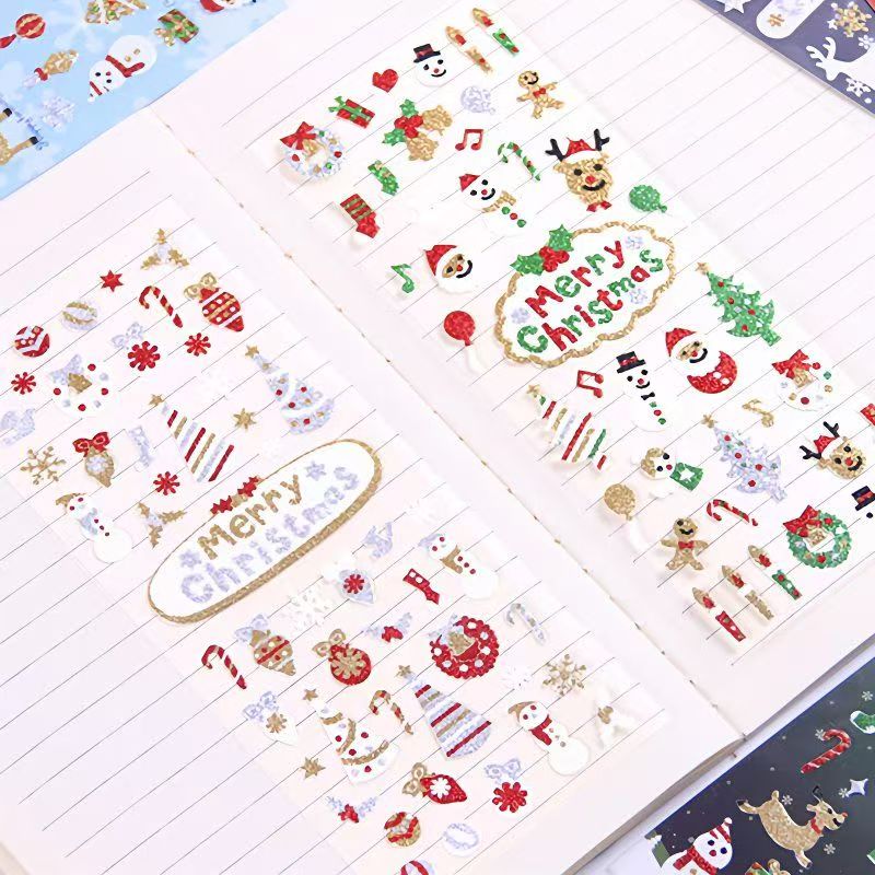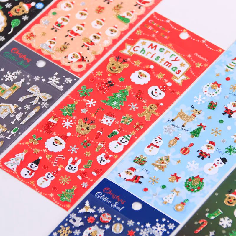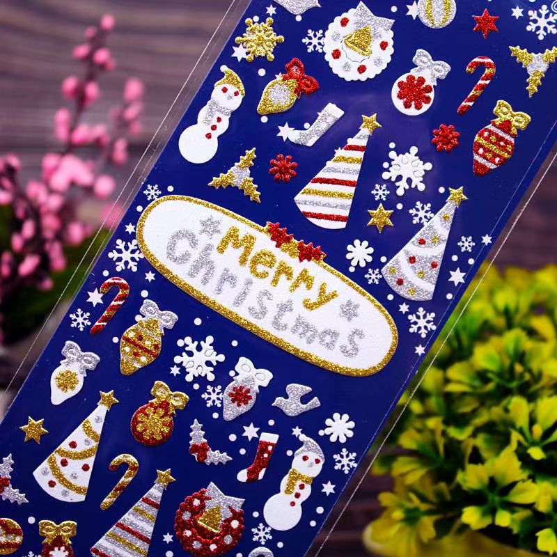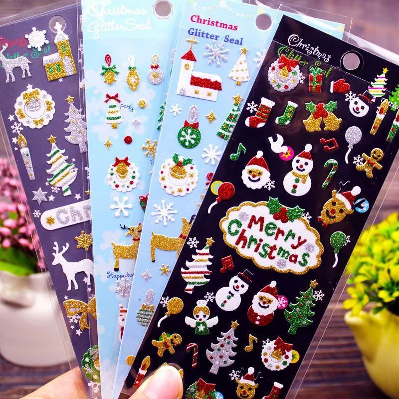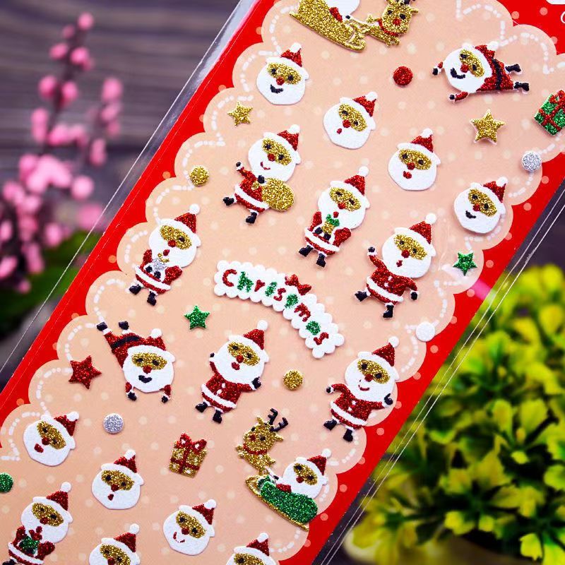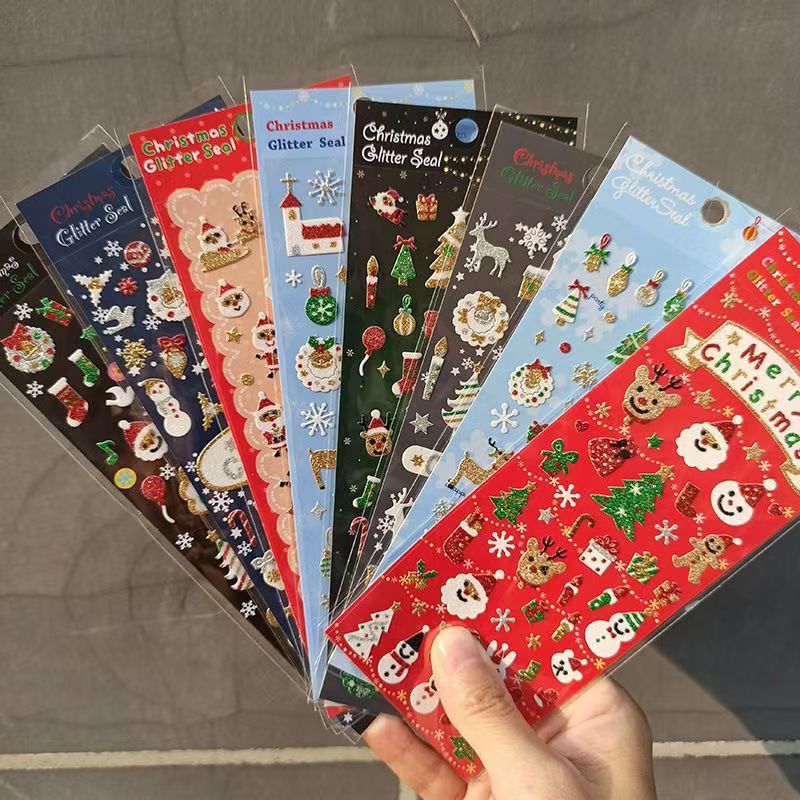 Jojo PackAng mga sticker ng Christmas glitter ay pandekorasyon na mga label ng malagkit na espesyal na idinisenyo para sa kapaskuhan. Ang kanilang pangunahing tampok ay isang layer ng makintab na glitter na nakakabit sa ibabaw, na lumilikha ng isang maliwanag at sparkling na epekto sa ilalim ng ilaw. Ang mga sticker na ito ay madalas na nagtatampok ng mga klasikong disenyo ng holiday tulad ng mga snowflake, Christmas tree, bituin, at reindeer. Sa kanilang masiglang kulay at estilo ng maligaya, perpekto ang mga ito para sa pagdaragdag ng isang masayang pagpindot sa iyong mga dekorasyon.