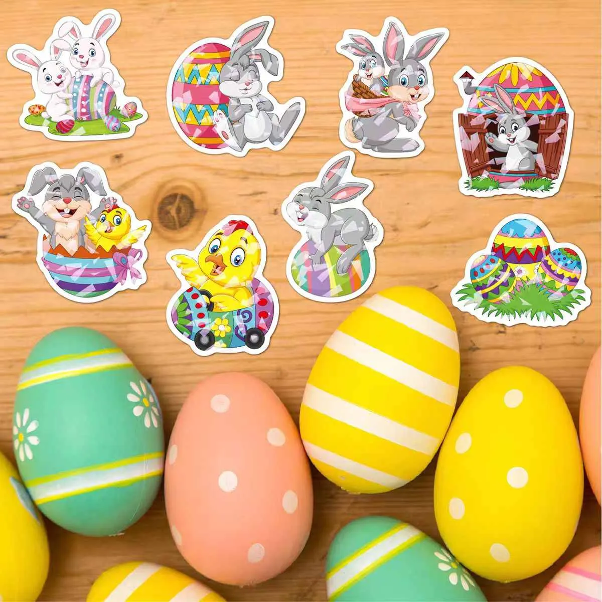 Tumutok sa mga itlog ng Pasko ng Pagkabuhay na may mga malikhaing disenyo kabilang ang mga klasikong polka tuldok, mga pattern ng floral, mga rabbits ng cartoon, at mga estilo na may mga aesthetics sa kanluran. Ang buong kulay na pag-print ng CMYK ay naglalabas ng maliwanag na mga shade ng pastel at gradients para sa isang matingkad na maligaya na hitsura.