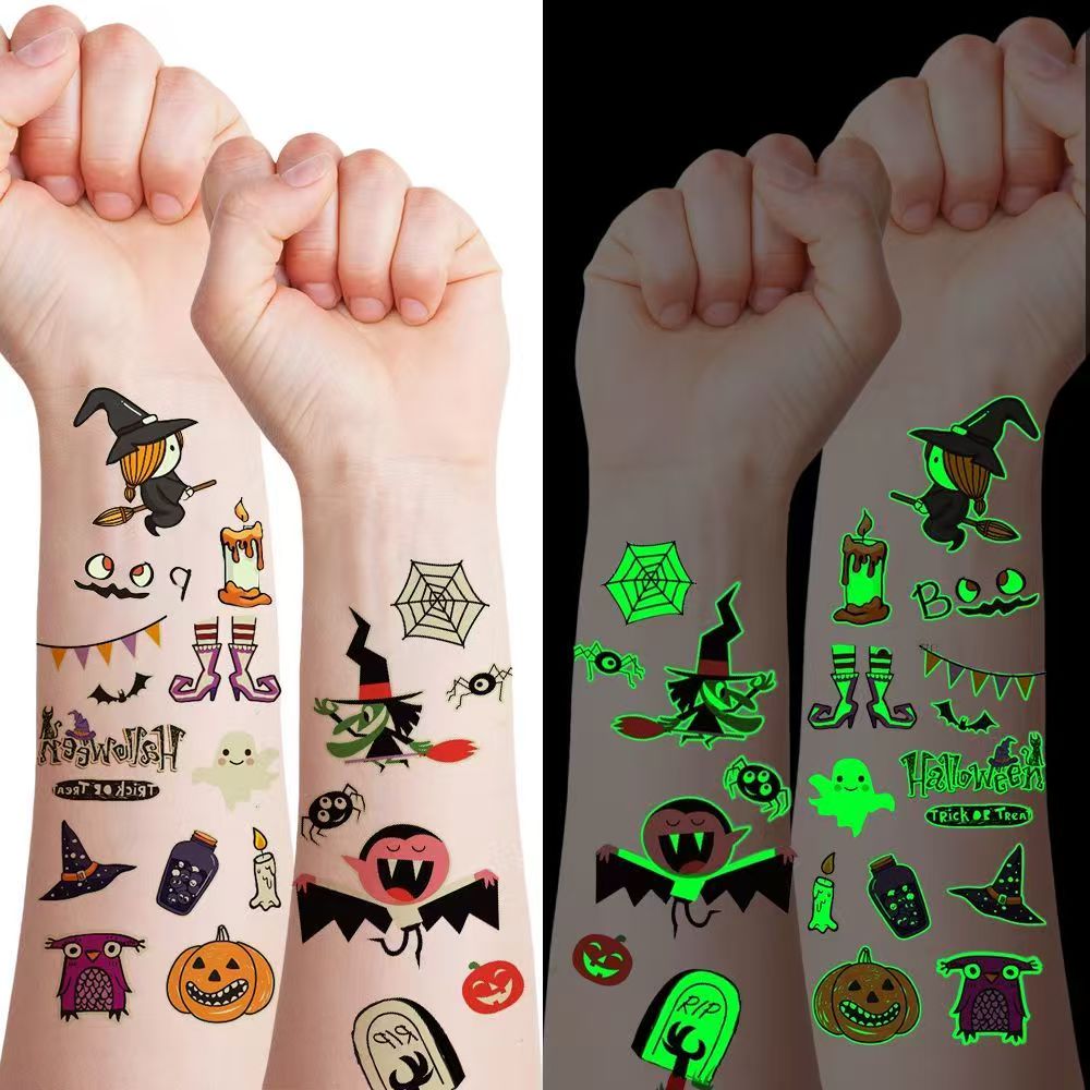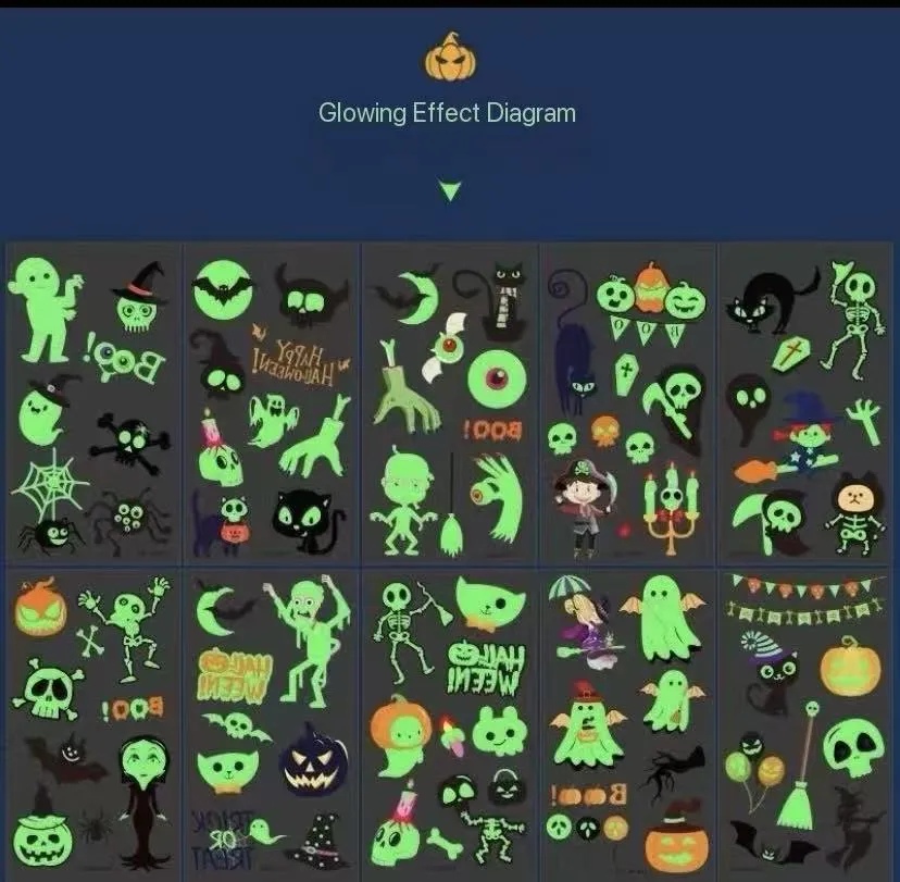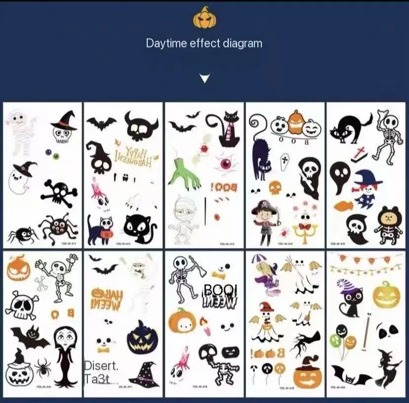 Ang Halloween Night Glow Tattoo Sticker na ginawa ni JoJo Pack ay natatanging dekorasyon na espesyal na idinisenyo para sa mahiwagang at masayang pagdiriwang na ito, na nagtatampok ng isang mayamang iba't ibang mga elemento ng Halloween. Ang mga pattern na ito ay hindi lamang simpleng dekorasyon; Perpektong isinasama nila ang kapaligiran ng Halloween, na ginagawa kang sentro ng pansin sa pagdiriwang.