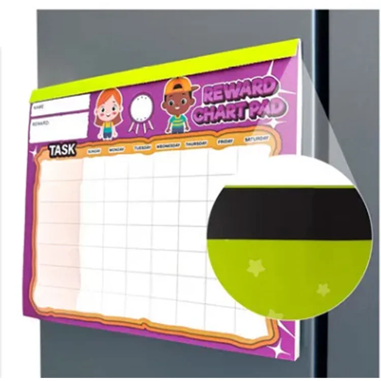 Ang reward chart pad ay angkop sa laki at nakakumbinsi para sa mga bata na kukuha, ang likod na nakakabit ng mga magnetics, kapag hindi ginagamit ito, maaari itong mai -attach sa mga produktong bakal tulad ng mga refrigerator. Ang takip na nakalimbag ng mga serrasyon para sa madaling luha.but mangyaring bigyang -pansin ang paglaban ng tubig habang ginagamit.