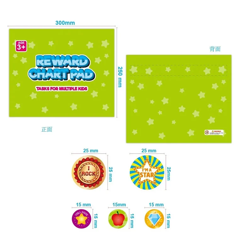 Sa magnetic reward chart pad, mayroong dalawang sukat ng mga sticker na magagamit. Ang mga maliliit na sticker ay dumating sa mga hugis tulad ng mga tropeo, araw, mga bituin, mansanas, brilyante ect sa iba't ibang kulay, ang mga malalaking sticker ay may mga slogan tulad ng 'Mayroon akong kapangyarihan' 'i rock!' Na -print sa kanila at kapag ang isang tiyak na bilang ng mga maliliit na stick ay na -accumulated, isang malaking sticker na gantimpala ang ibibigay, na nag -uudyok sa mga bata na natapos ang kanilang pang -araw -araw na mga taludtod.