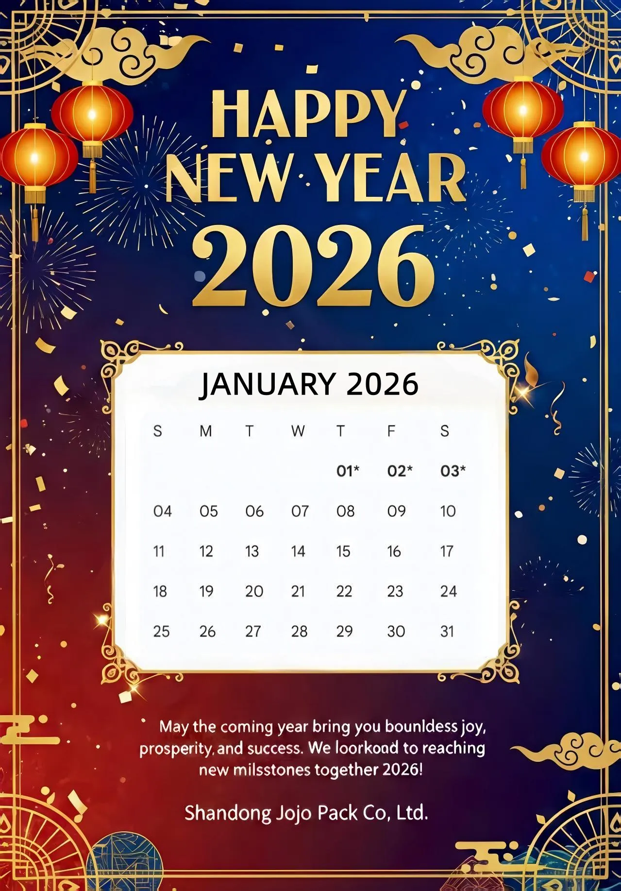 Panahon ng Bakasyon:Enero 1, 2026 hanggang Enero 3, 2026, magpapatuloy ang mga normal na operasyon ng negosyo sa ika-4 ng Enero, 2026.